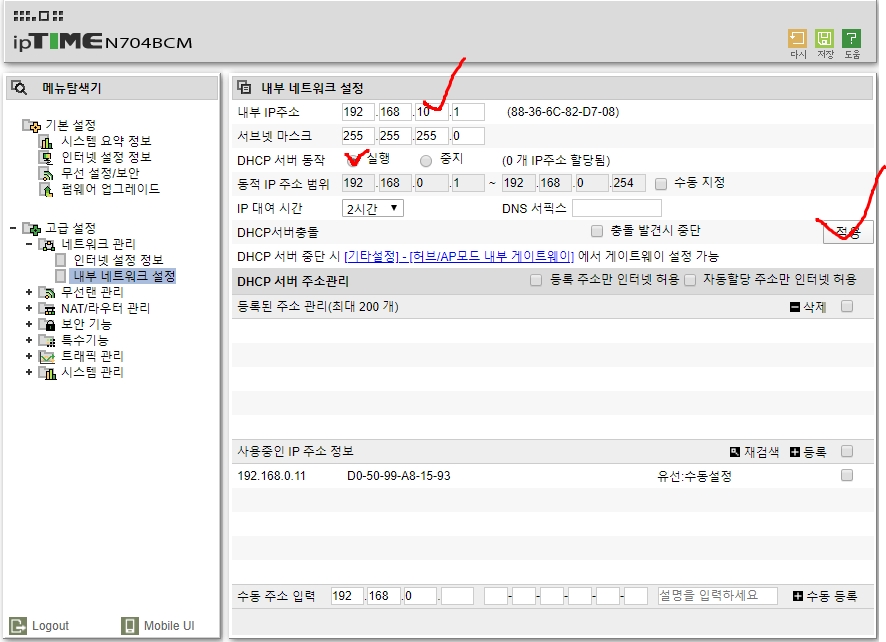 일단 상위 공유기가 아이피 타임이면 내부 아이피가 같기 때문에 주소를 변경을 해야 하는데