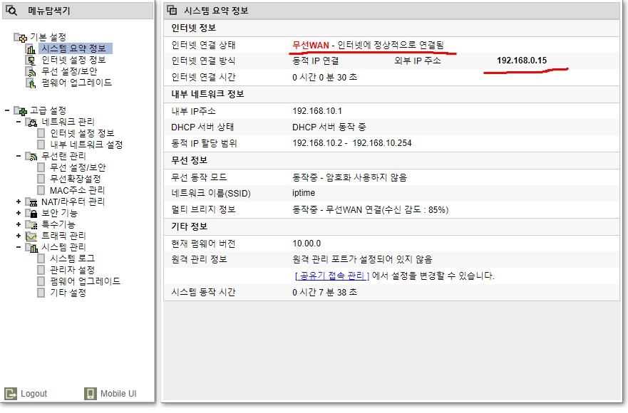 외부 ip 192.168.0.15로 상위 공유기의 아이피를 받아온 걸 확인할 수가 있겟습니다.